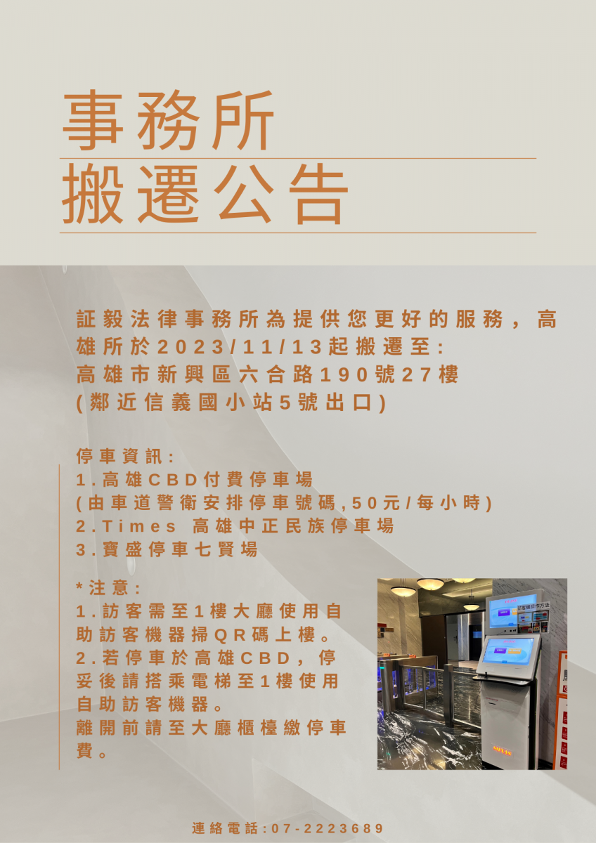 証毅法律事務所目前已在新址為大家服務,敬請各位舊雨新知繼續支持! 地址 : 高雄市新興區六合路190號27樓 / 聯絡電話 : 07-2223689